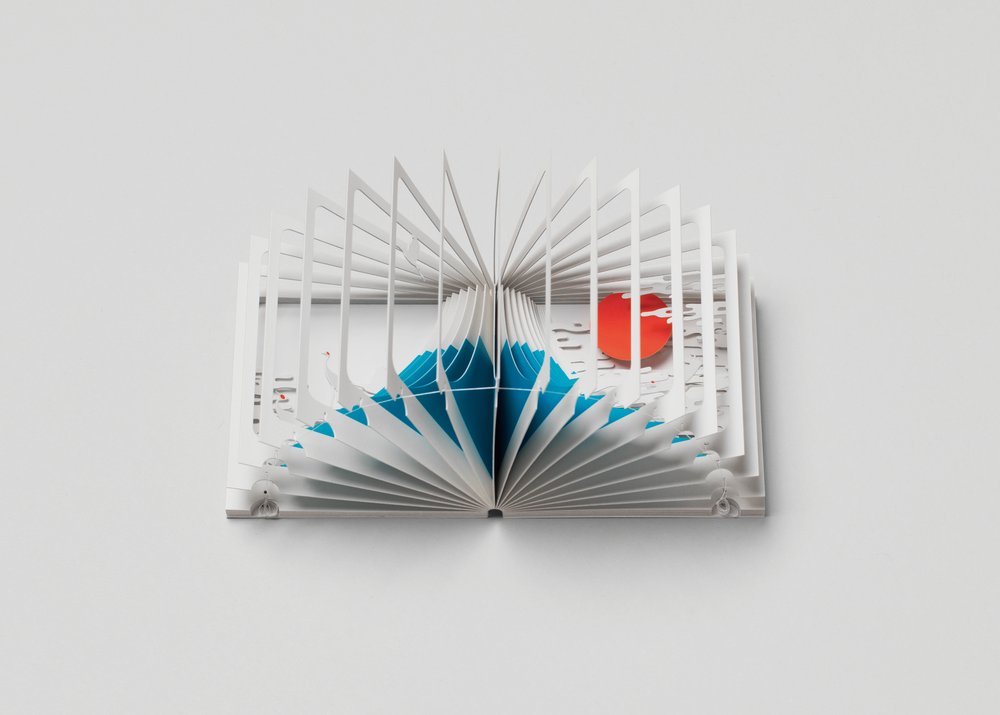日本建築師大野友資(Yusuke Oono)就受到富士山的感召,設計了一款特殊的立體書,打開後將封面和封底合在一起,就變成一個精緻小巧的圓柱體桌飾,從各個角度都可以欣賞到作品的內頁。