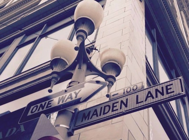 Maiden Lane —有著特殊雅致街名的「仕女巷」, 注定了她天生不凡的遭遇。在靠近聯合廣場東側 Neiman Marcus 的這一頭,介於 Stockton St. 和 Geary St. 之間,有一條頗有歷史的人行巷弄區塊 Maiden Lane (仕女巷),這條精巧的巷子,在廣場鬧中取靜,行人匆匆,一不注意,很容易忽略了她的存在。步行於只有短短兩個街口長度的巷弄,卻跨越了舊金山最繁華城市心臟的前世與今生。