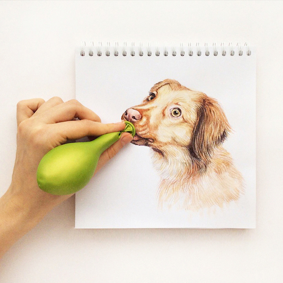 來自俄羅斯的插畫藝術家Valerie Susik的創作主題幾乎都脫不了動物,尤其是以身邊的貓貓狗狗的數量為最多。而這一系列的互動插畫又以好動的小狗為主角,利用實際生活中的個是用品來產生有趣的互動效果,像是淡定的狗狗看著無聊的主人用吹風機把自己的耳朵吹起來;超熱愛游泳的小狗到蛙鏡就興奮到不行;還有貪吃的小狗也想舔舔主人手上的棒棒糖。