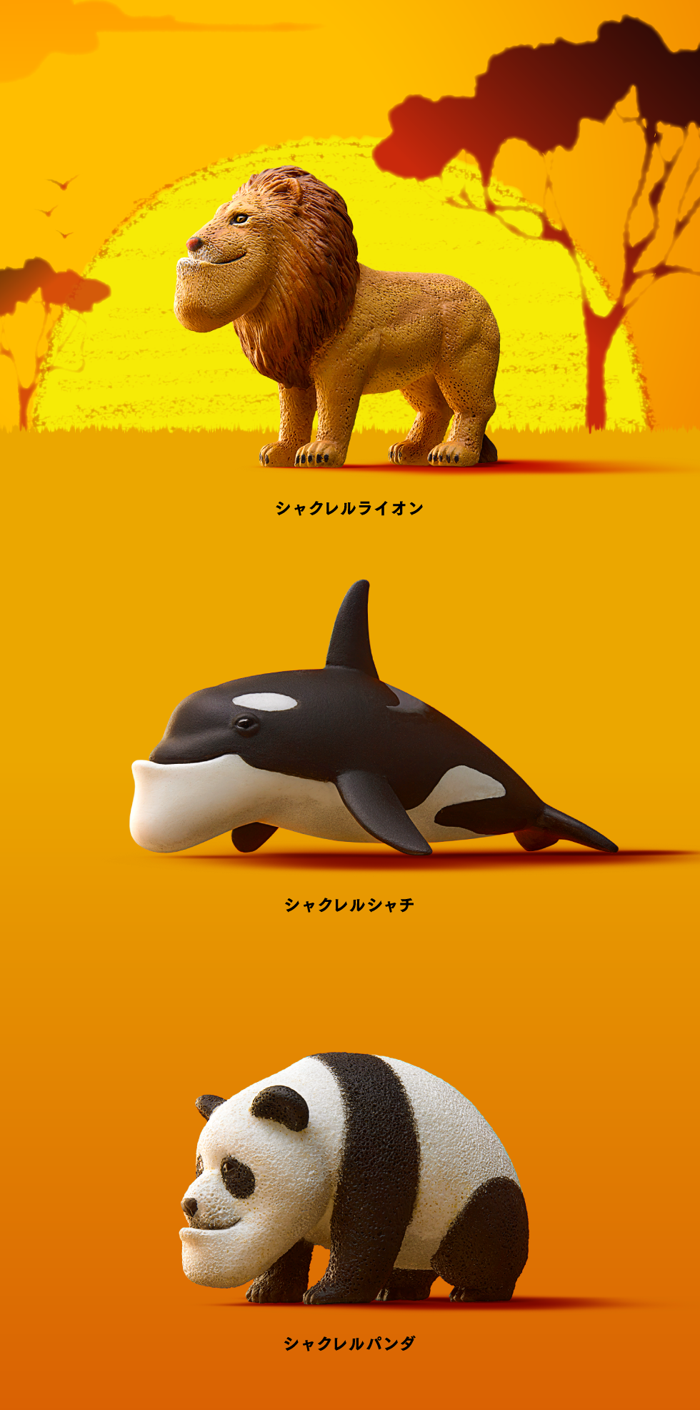 一群長著戽斗的動物們精神抖擻地站在夕陽下,牠們望著遠方,眼神驕傲而明亮,彷彿未來充滿希望,但凸出的厚下巴卻讓人忍不住噗ㄘ一笑,徹底展現 Takara Tomy 的惡搞精神!