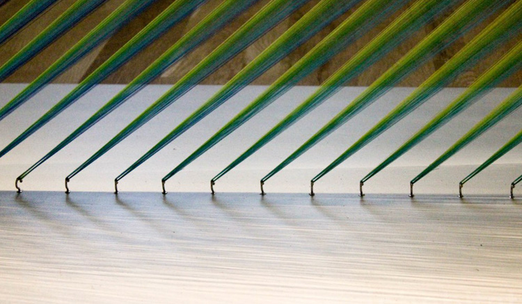 這次在華盛頓展出的「Plexus A1」在實體絲線中竟有若隱若現的非真實感,呈現近乎如光一般的色彩暫留。乍看之下好像只是將絲線拉直的藝術品,實際上,無論在結構或是技法都極為複雜。系列作品名稱物如其名,「Plexus」譯為錯綜複雜的網狀組織,Gabriel Dawe 自製巨大棒針穿縫這片彩虹瀑流,每一條絲線必須與上千條其他絲線交叉連結,才得以呈現立體的圓弧結構,以及線與線所呈現出來的張力。