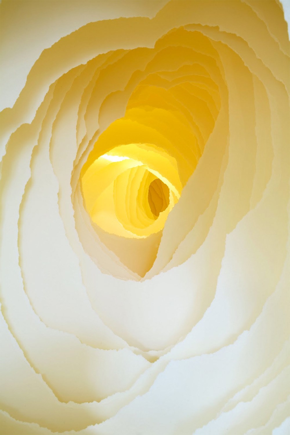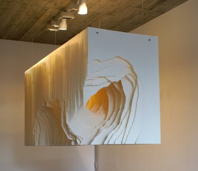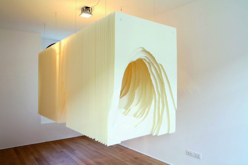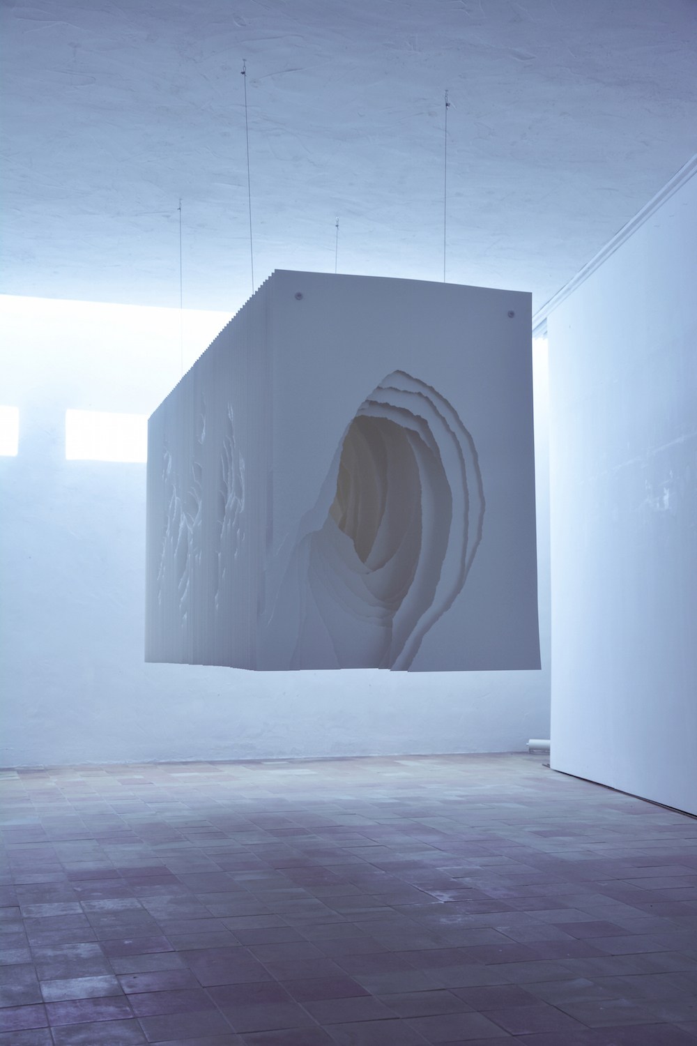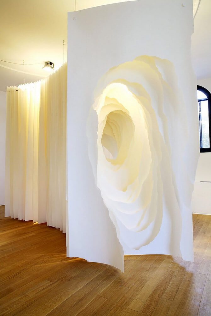 猶似於洞穴的深景,藝術家卻以白色的紙張搭配暖色調的光線做呈現,企圖藉此呈現出有別於我們對於洞穴的印象,用「白」來層疊地襯出存在於不同視野中所得以 看見的,而在不同高度、垂吊的陳列方式中,又豐富地帶入多一種詮釋手法,令張張紙片都能擁有令人想進一步探訪那抹蘊含著「光」的隧道,神秘、予人驚嘆!