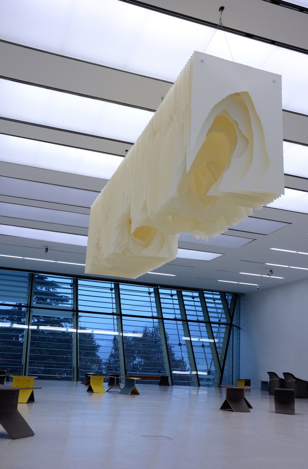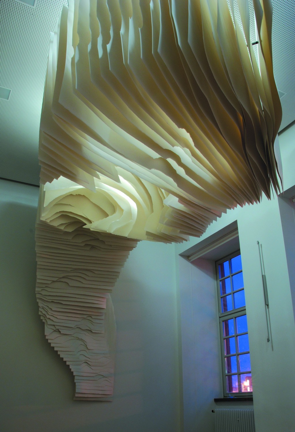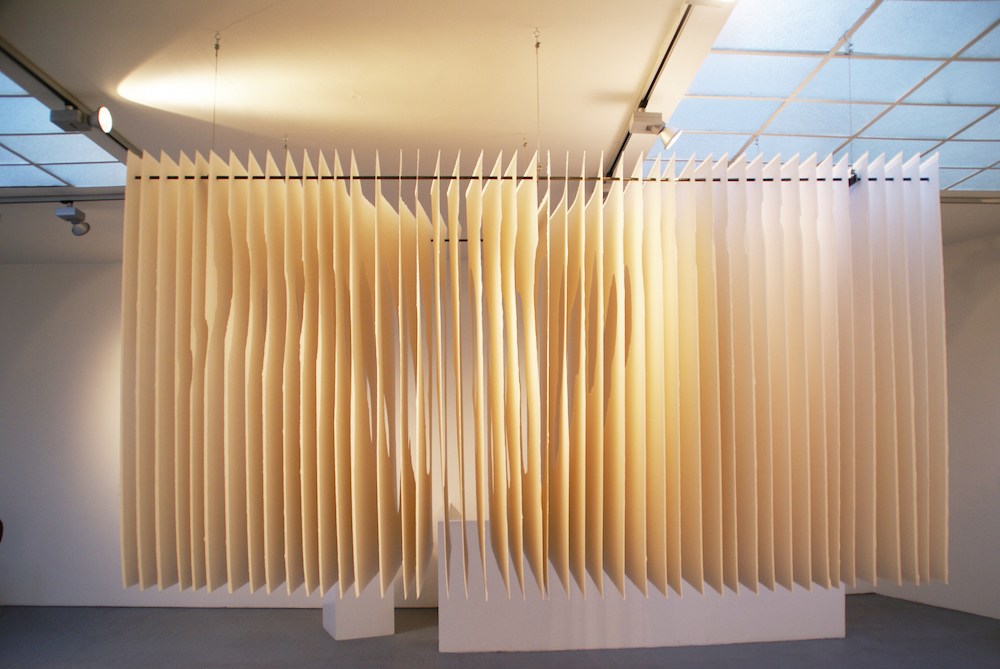 猶似於洞穴的深景,藝術家卻以白色的紙張搭配暖色調的光線做呈現,企圖藉此呈現出有別於我們對於洞穴的印象,用「白」來層疊地襯出存在於不同視野中所得以 看見的,而在不同高度、垂吊的陳列方式中,又豐富地帶入多一種詮釋手法,令張張紙片都能擁有令人想進一步探訪那抹蘊含著「光」的隧道,神秘、予人驚嘆!