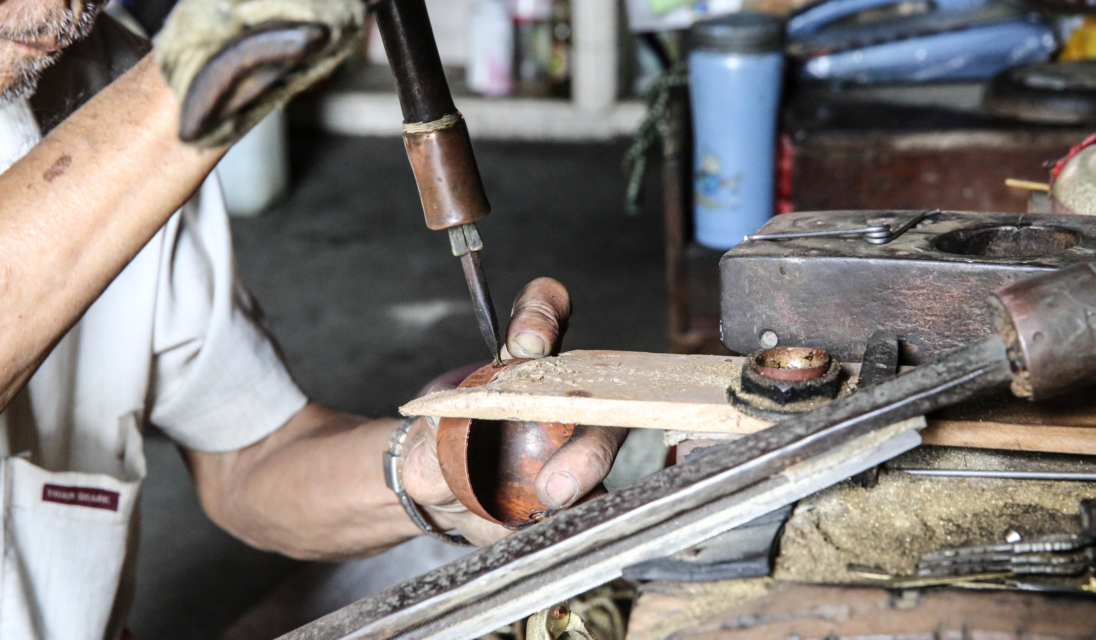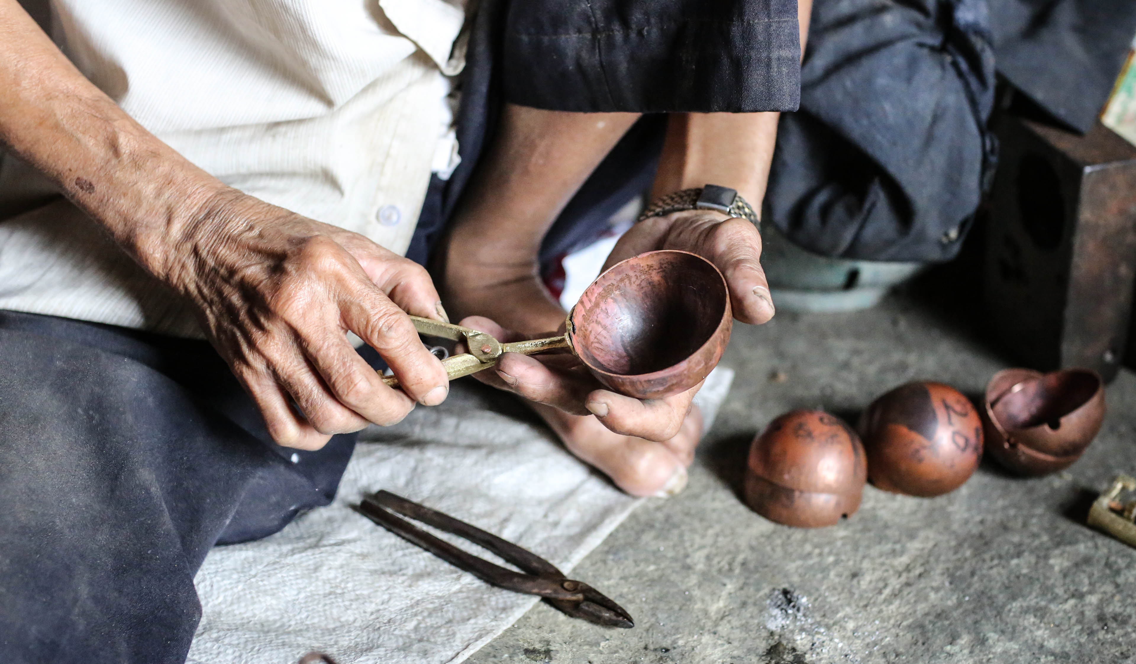 問黃有信阿公:「這工作哪兒最艱苦?」他笑答「一直坐著最苦。」聽起來這個工作很容易似的,其實不然。當天,端詳黃有信阿公工作幾小時,看著他專注手上的工作都不太想也不太敢出聲打擾,因為製作銅冰勺雖然不需勞動,但全程都使用著危險工具,比如:燒得滾燙的烙鐵、鹽酸、沒停過的瓦斯爐、焊錫……,只見他不斷地將烙鐵沾上融化的錫珠子、鹽酸,將銅片敲成的球形勺體黏接在柄上,徒手握著燒紅的烙鐵往導熱極佳的銅球不停觸碰,烙鐵沾錫珠子碰到銅球會發出「嘶~~~」那種滾燙的聲音,焊錫和烙鐵常觸在拿銅球的指尖上,光看就不禁跟著縮手,黃有信阿公卻氣定神閒。