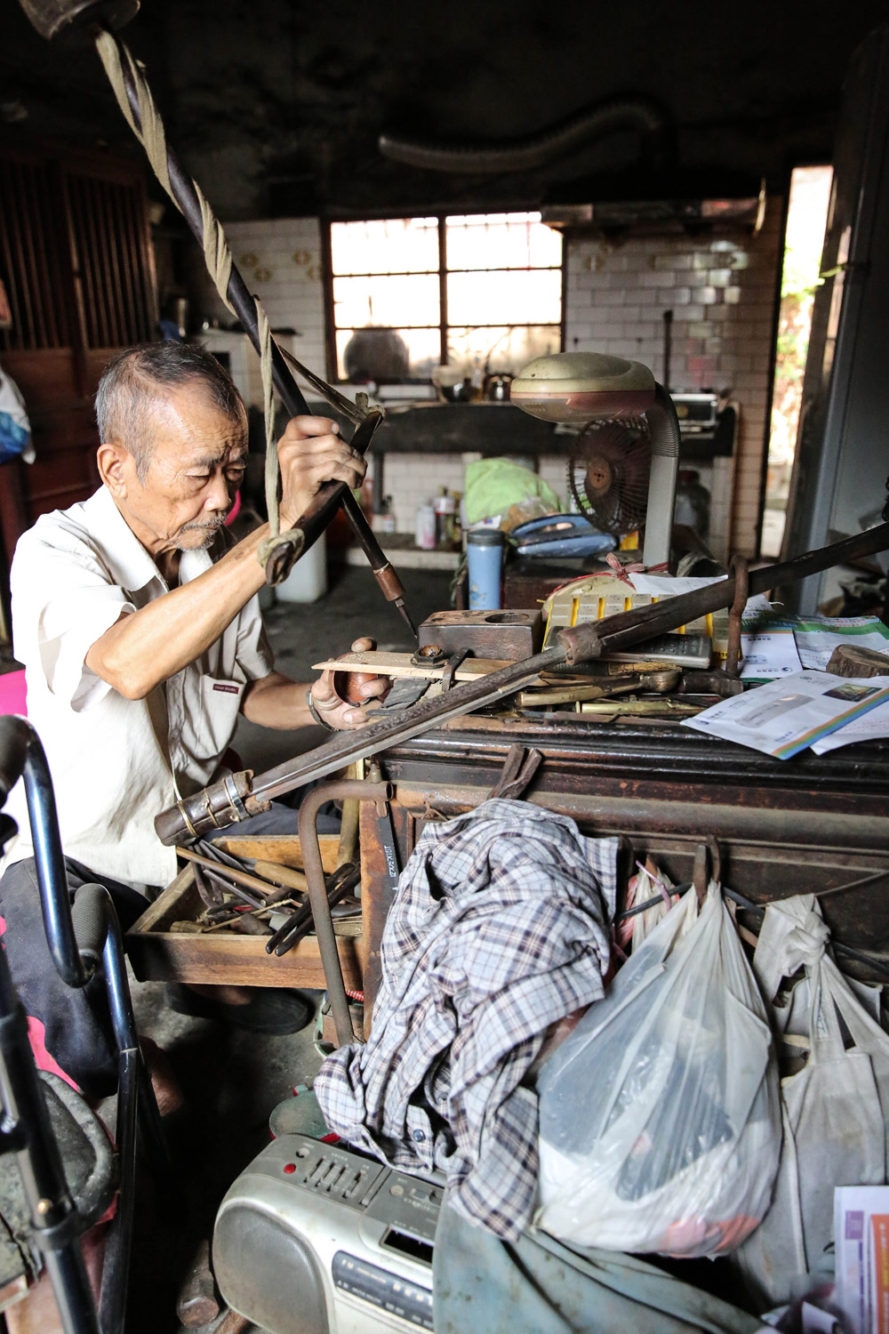 整場訪問對話不多阿公總是回得平淡怡然。八十六年的人生路、超過一甲子職涯的艱辛,不就如那剛剛握在手中不再感覺熱燙的烙鐵、使大勁不覺沉重的手動鑽孔器,旁人看來震懾的一切,不過僅是他如飲水自得的「生活」爾爾,能怎麼著墨?但這些「生活」或許未來臺灣任何人無法再過,所以只能定睛看著阿公淺淺談、淡淡做,深深與他、與眼前的一幕幕銅冰勺工藝道別。