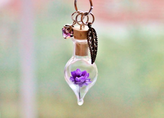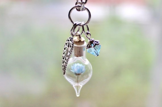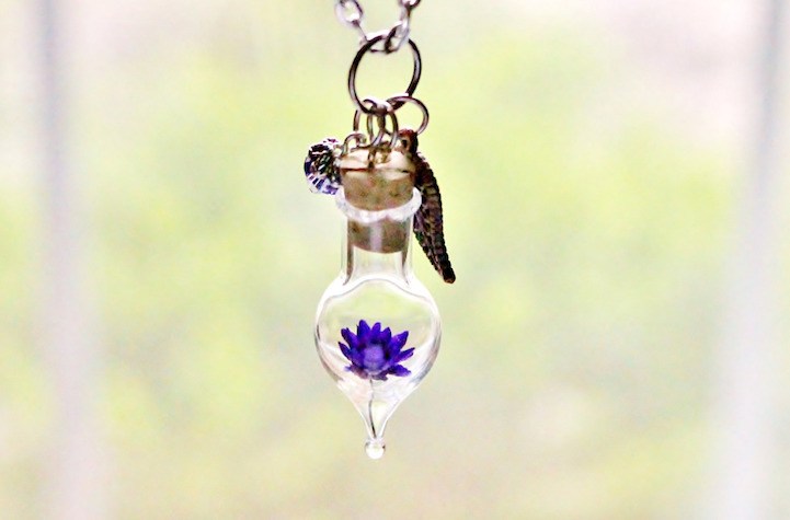 來自佛羅里達的 LD,在她 Teeny Tiny Planet 系列的手作飾品裡,把迷你乾燥花放進有著水滴般造型,拇指大小的玻璃容器中,製成一條條項鍊。隔著一層玻璃,在裡頭的這一朵小花,讓人想到小王子 B612 星球中他放在玻璃罩中悉心呵護的那朵玫瑰,而透過這些飾品,人們也有機會擁有自己的玫瑰了!