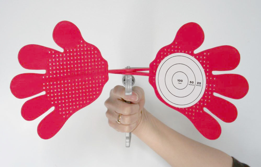 國外賣的一組有趣的蒼蠅拍,外型就像小時候常玩的橡皮筋槍,前端是一雙紅色大手掌,扣下板機時,就會拉動手掌開闔。