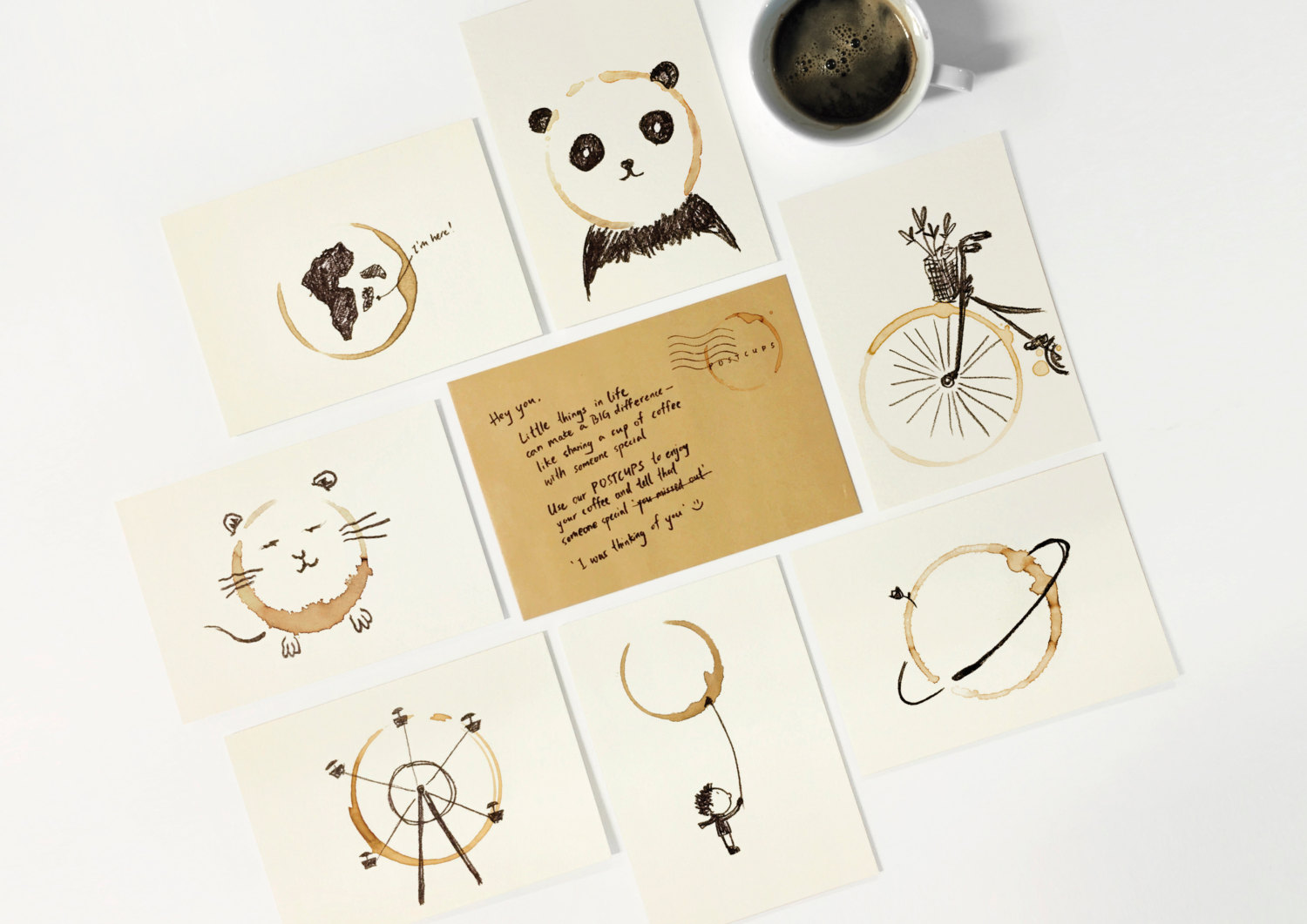 為了讓咖啡漬能順利印上去,PostCups 使用 300gsm 的水彩紙,肌理明顯手感紮實,就算真的拿來當杯墊也不會覺得奇怪。
