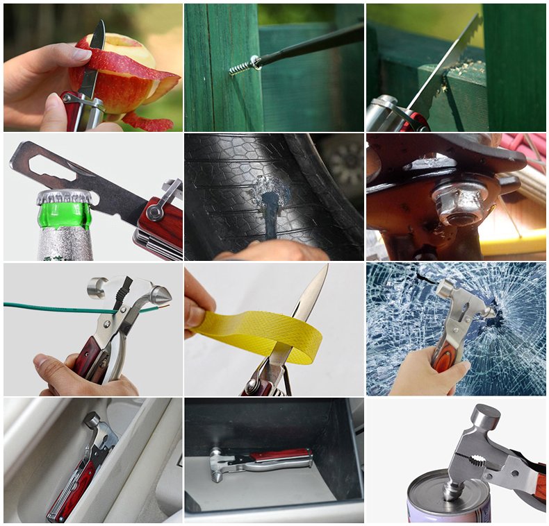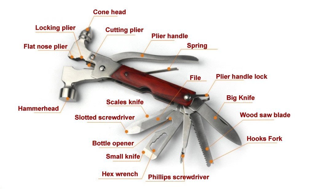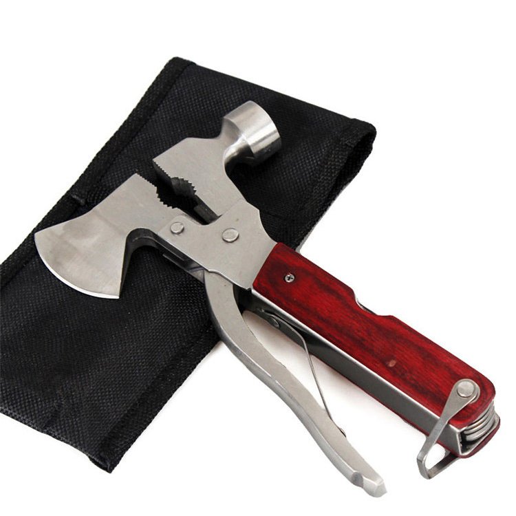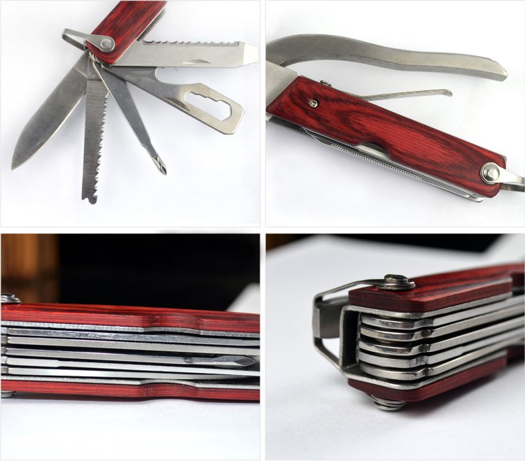 它有哪些狂暴的工具呢:鋸子、小刀、十字與一字螺絲起子、板手、大刀、彈簧、圓頭鎚、平頭鎚、開罐器、老虎鉗、以及斧頭! 整把折疊多功能刀是由不鏽鋼製成,再加上那木紋的手柄,這根本就是一隻太完美的攻城用武器啊!