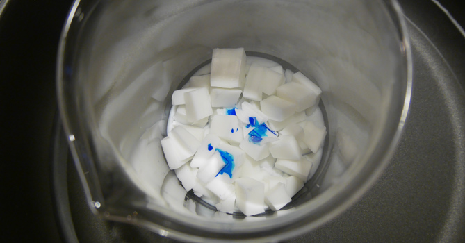 步驟3. 剛切掉的邊邊切成丁狀並隔水加熱,並加入顏色跟味道(精油)