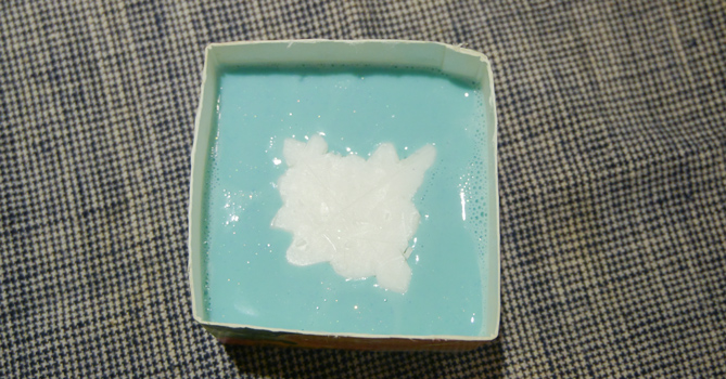 步驟4. 倒入有顏色的皂基,過大約 15 秒,再置中放入白色部分(不然會被融掉邊邊)