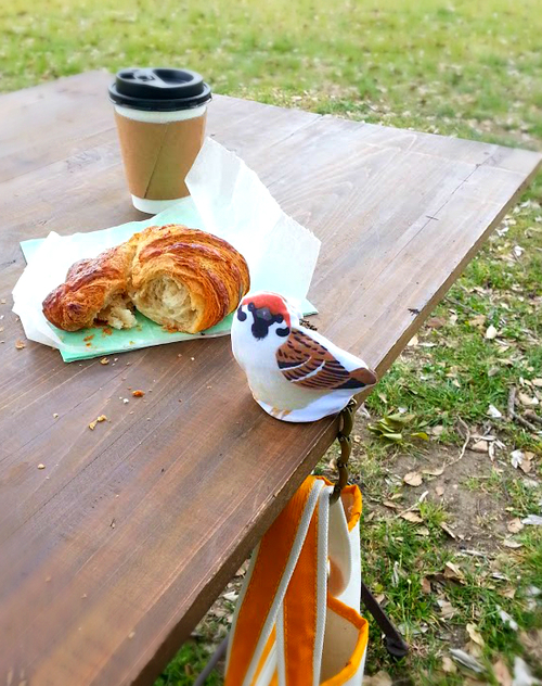 像這樣掛在桌側,跟餐桌上的麵包屑屑也是相當絕配阿XDD 小鳥包包掛勾一顆售價日幣1,950,有興趣的人可以上網找找囉!