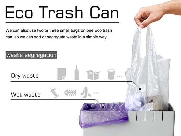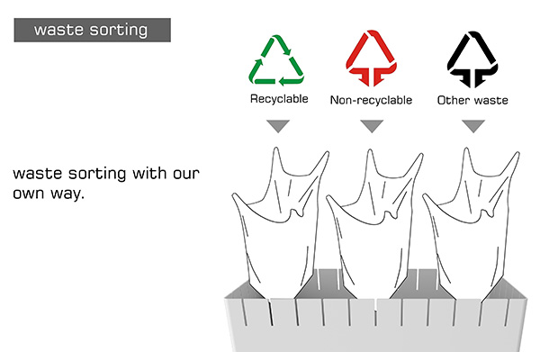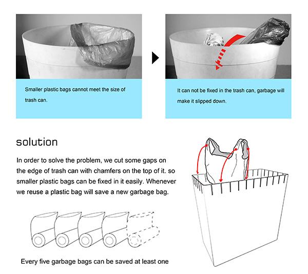 這款得到 2014年德國紅點設計獎的得獎作品,是由廈門理工學院的張抱一和胡玲玲兩人所設計,將垃圾桶的上緣做出間隔凹槽,可以單獨使用,也能套上多個小型背心袋當作小型分類回收桶,概念相當簡單卻超級實用。