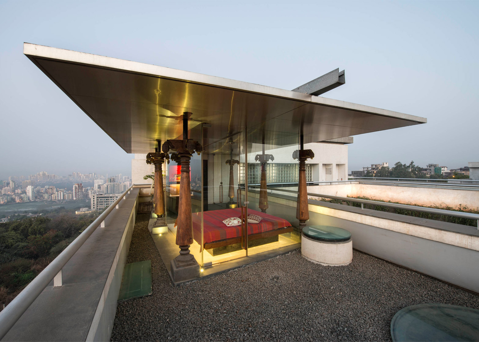 Collage House的頂樓是輕型鋼架和玻璃所打造的涼亭,涼亭屋頂是現代化的太陽能面板,靠著有著100年歷史的木頭圓柱支撐著,就好像空中版的發呆亭一樣,或坐或躺,或趴或滾,憑藉著位於山丘上的地勢高度,遠眺遠方的城市景致,好像整個人的身心都開闊了起來。