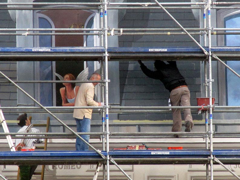由於牆壁面積不小,每次工程所需的時間也不一定,有時春去秋來、一旁的行道樹葉子都掉光了、有時 Patrick Commecy 也會動點小手腳,用後製方法去除掉一些路標,讓畫面更完整。