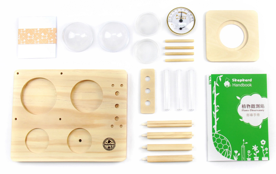 《植物觀測站》將重達 980 公克的歐洲山毛櫸實木精心雕琢,加上無色、無毒的透明防水漆,製作成供您組裝的平台裝置與零件,搭配 24 頁全彩圖文說明手冊,讓臺灣獨有的溫度,收納於筆電大小的空間。