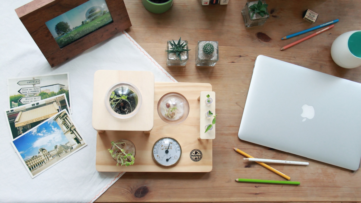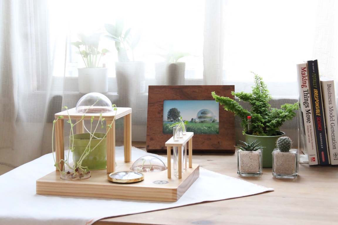 與一般的桌上型植栽裝置不同的是,《植物觀測站》上另設計了一組微型溫室,讓每個人體驗不一樣的種植樂趣。