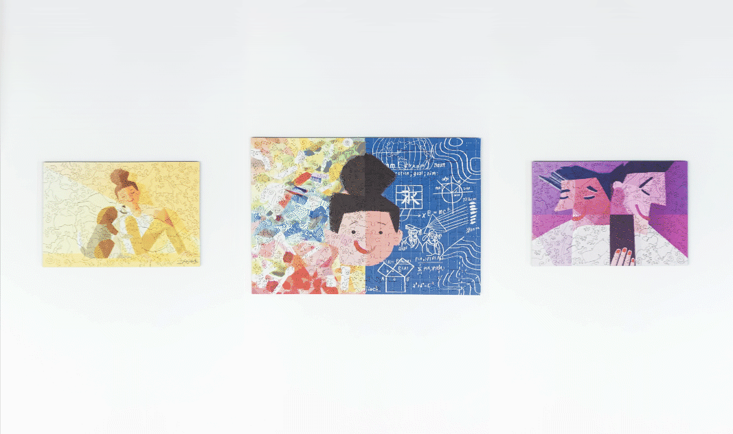 透過 JiaJiach 溫暖的筆觸,畫出少女與狗狗的溫馨相處時光的「陪伴」,戀人之間相愛的擁抱的「愛」,分別掌管理智與感性的左右腦世界的「方向」,以及家人慶生的愉快時光「全家福」。