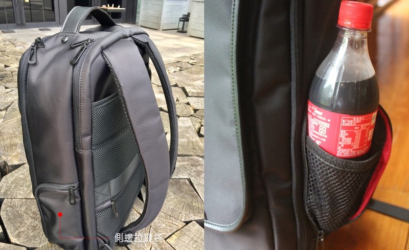 側邊拉鏈袋很適合用來放衛生紙、捷運票卡等物件,裡面加車的彈性網袋,拉出來後就可以容納瓶裝水或者雨傘,方便固定。
