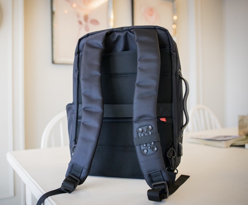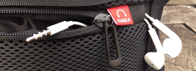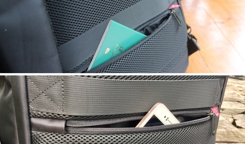 貼近身體的厚襯網布,底下有防盜式拉鍊袋,主要是出國或外地旅行使用、用來貼身收納重要物品的空間,但也不能為了防盜結果自己也拿得很辛苦,於是預留了有線耳機孔,就算平常使用時也能很輕鬆。