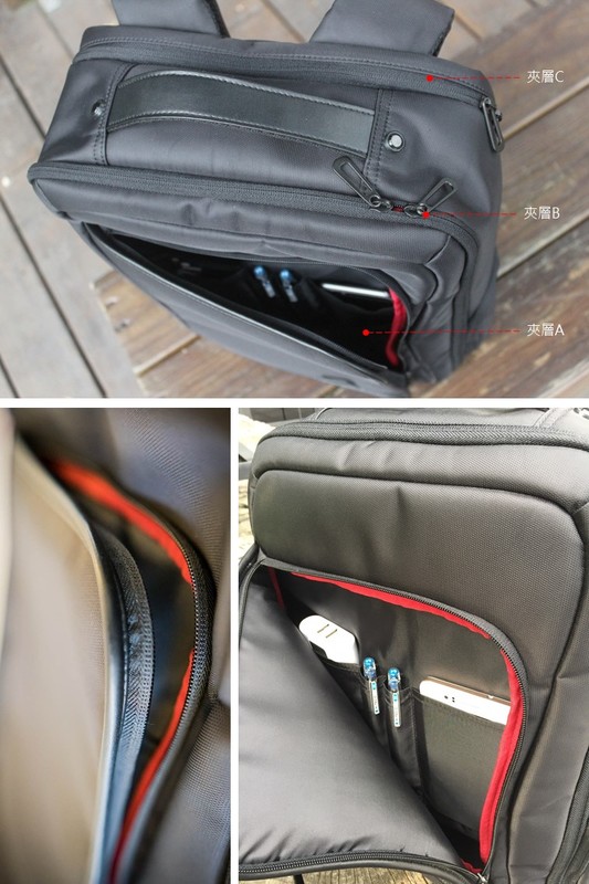 B夾層裡有筆電夾層,用來放置15吋以下的筆記型電腦或者文件夾,如果超過15吋的筆電,可放置到最裡面的C夾層。