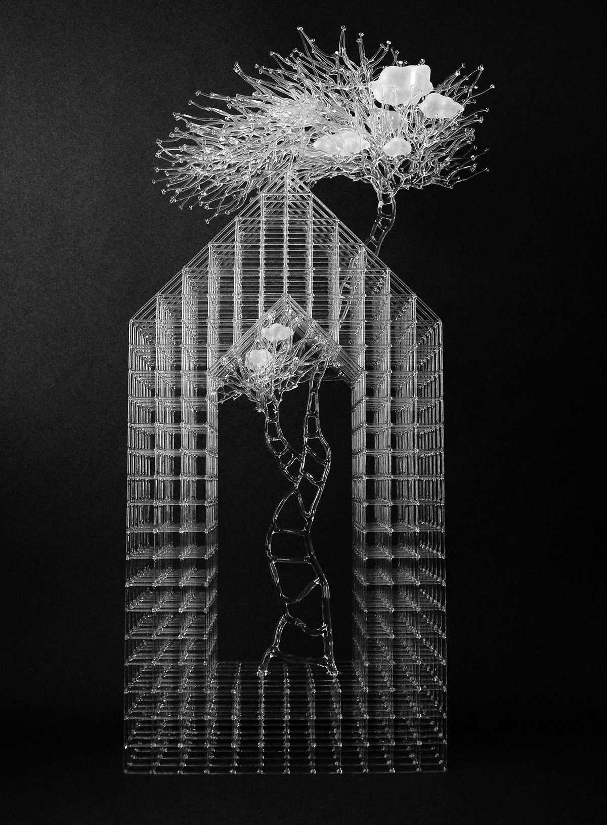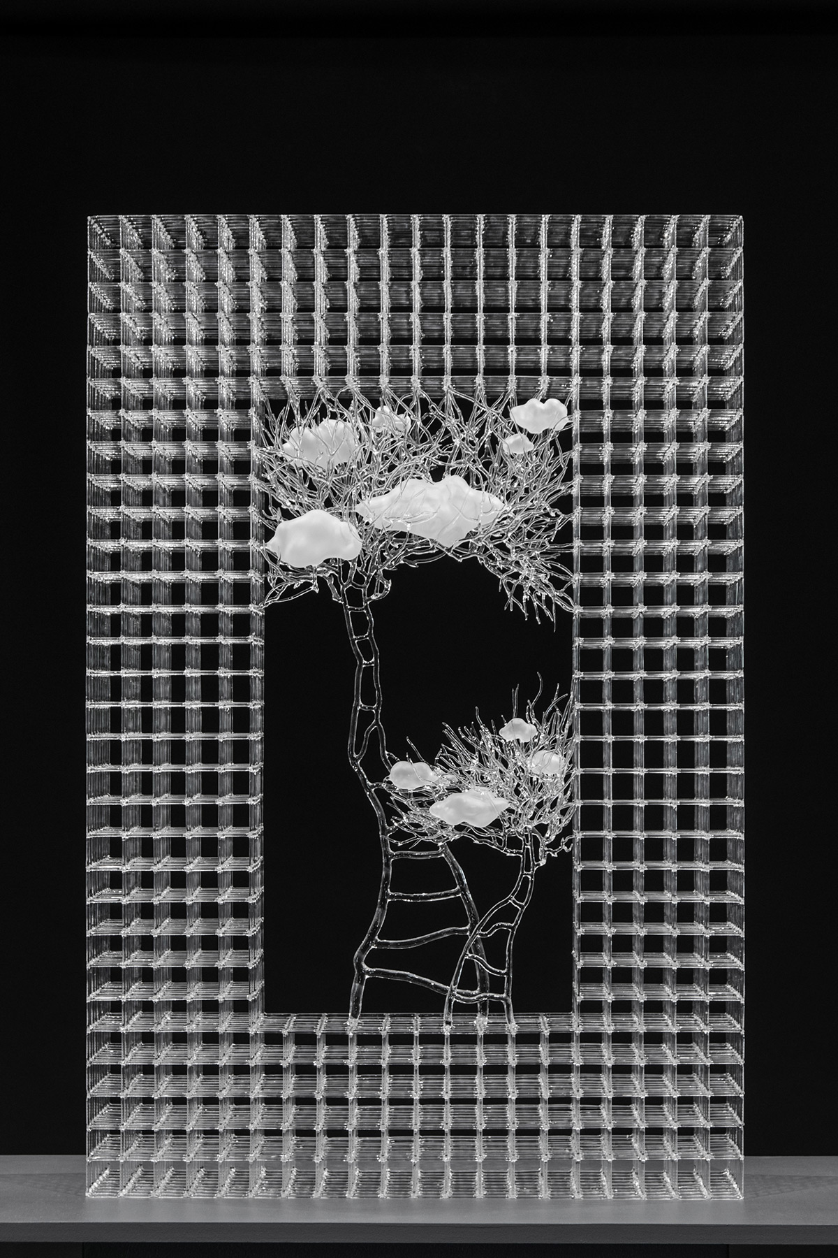 除了梯子之外,樹木、雲朵、盒子、房子也是Choi常使用的創作元素,或者是努力向上生長的樹枝,捧著原本遙不可及的白雲,撐起一個家,或是大小不一的長方體,堆疊出隨時可能傾倒的恐怖平衡。種種人生歷練經過玻璃藝術美化後,就好像經過美肌、柔焦修過的照片,所有的辛苦都不值得一提了。
