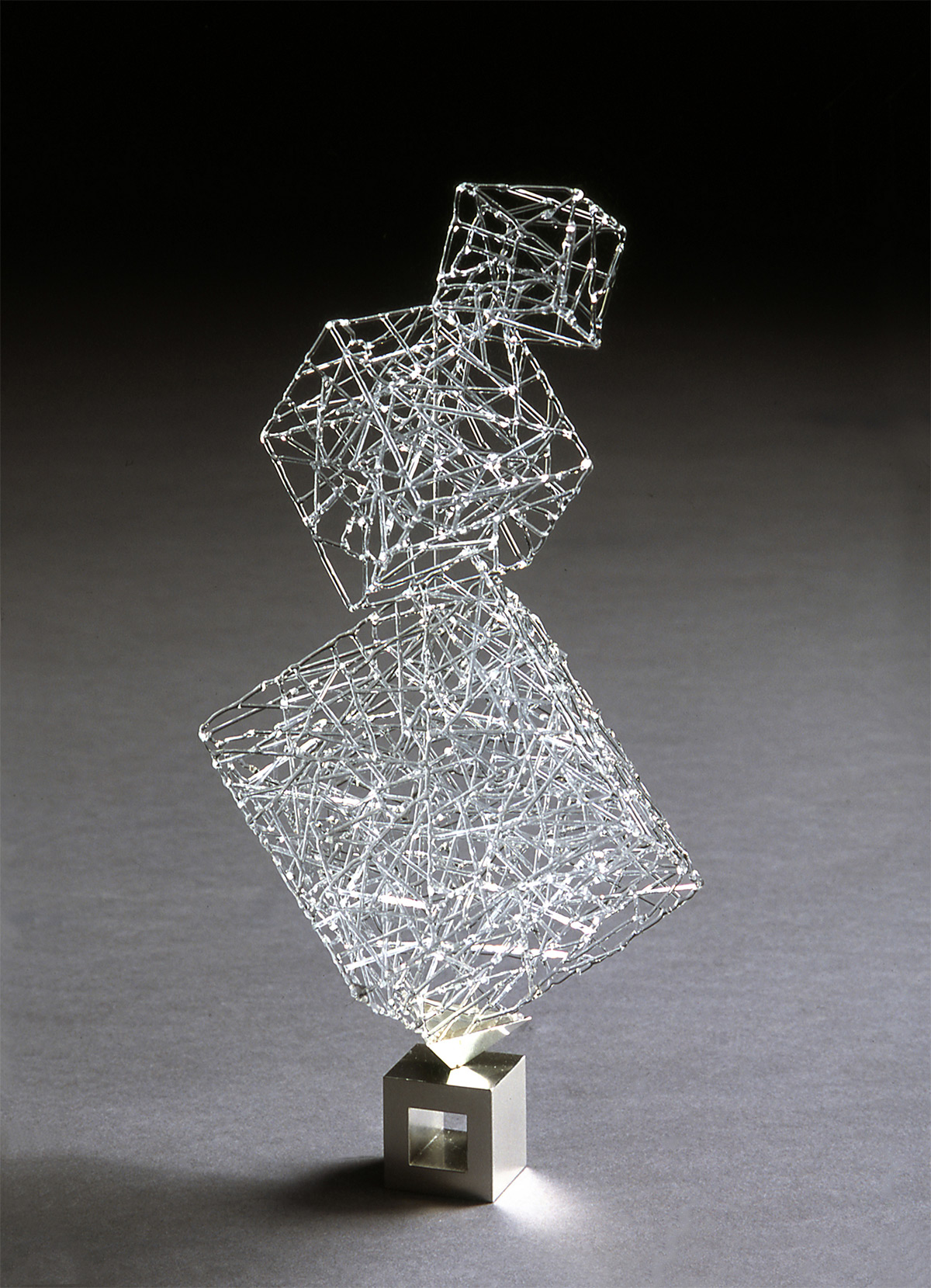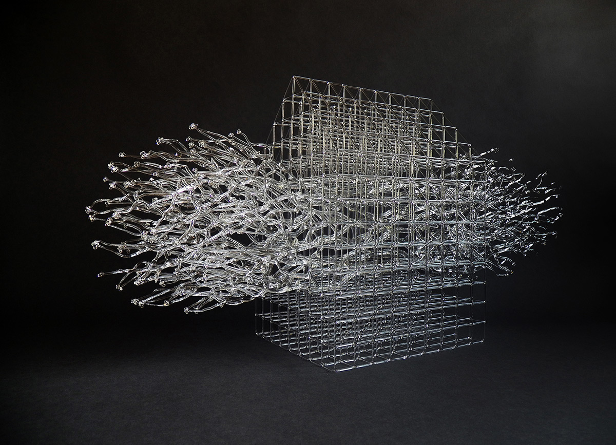 火工玻璃是一種用火槍將硼矽酸鹽玻璃棍加熱、然後彎折出格子般結構的玻璃藝術,經過火焰淬鍊後的火工玻璃,實際上比外表看起來強韌許多,比喻著一旦度過一關關考驗,至少能讓人更為堅強、堅定、堅決,不枉走過這麼一遭。