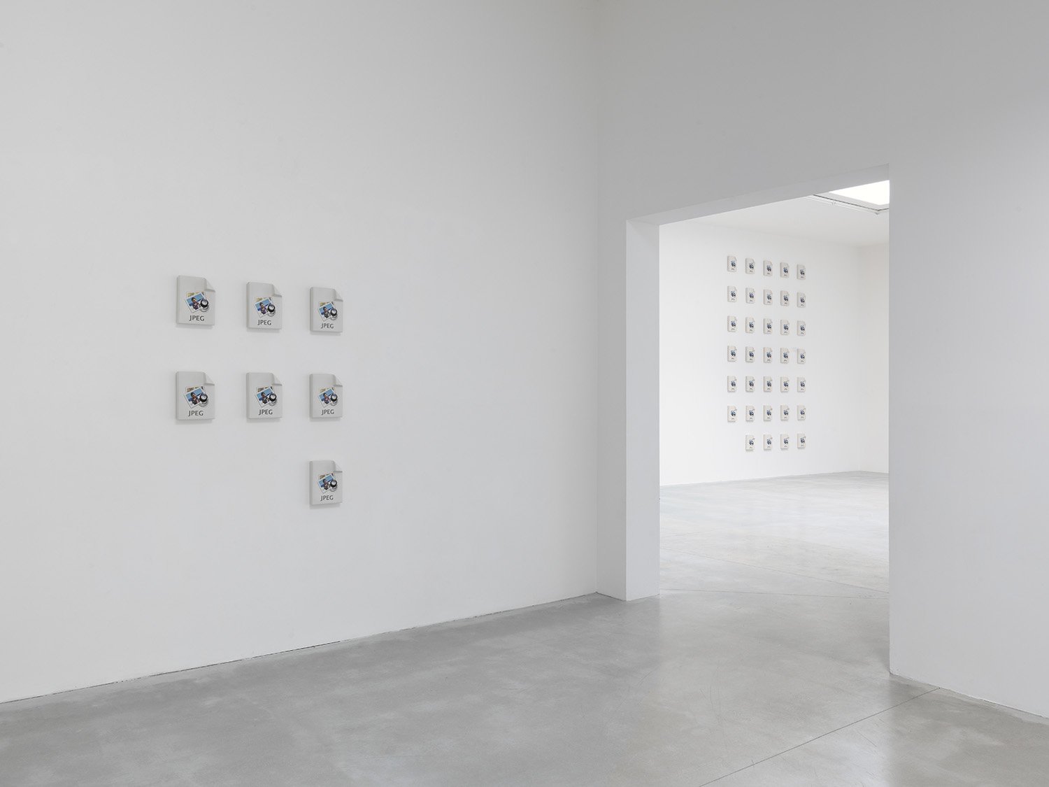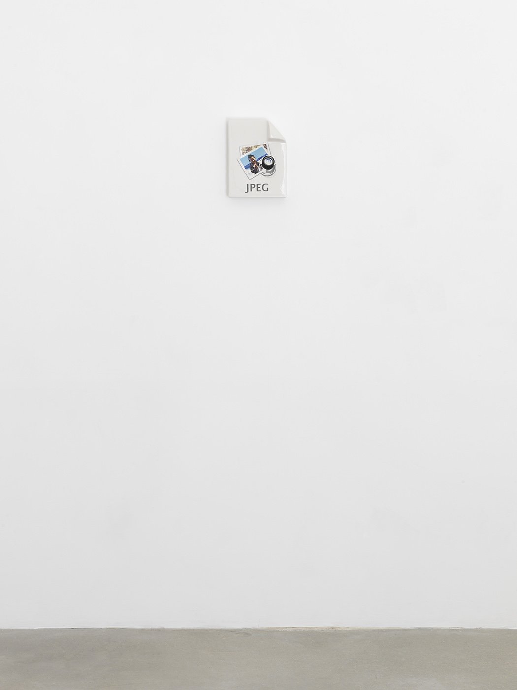 從另一個角度來看,這些「相片物體」有的孤伶伶的掛在牆上,有的則擺出團結就是力量的陣仗,放在白色的牆面上,還真像是面對著不知名的檔案夾,但當JPEG從虛擬影響格式成為現實雕刻作品,彷彿也提醒著大家,虛擬世界早已走出電腦與網路,成為現實生活的主角。
