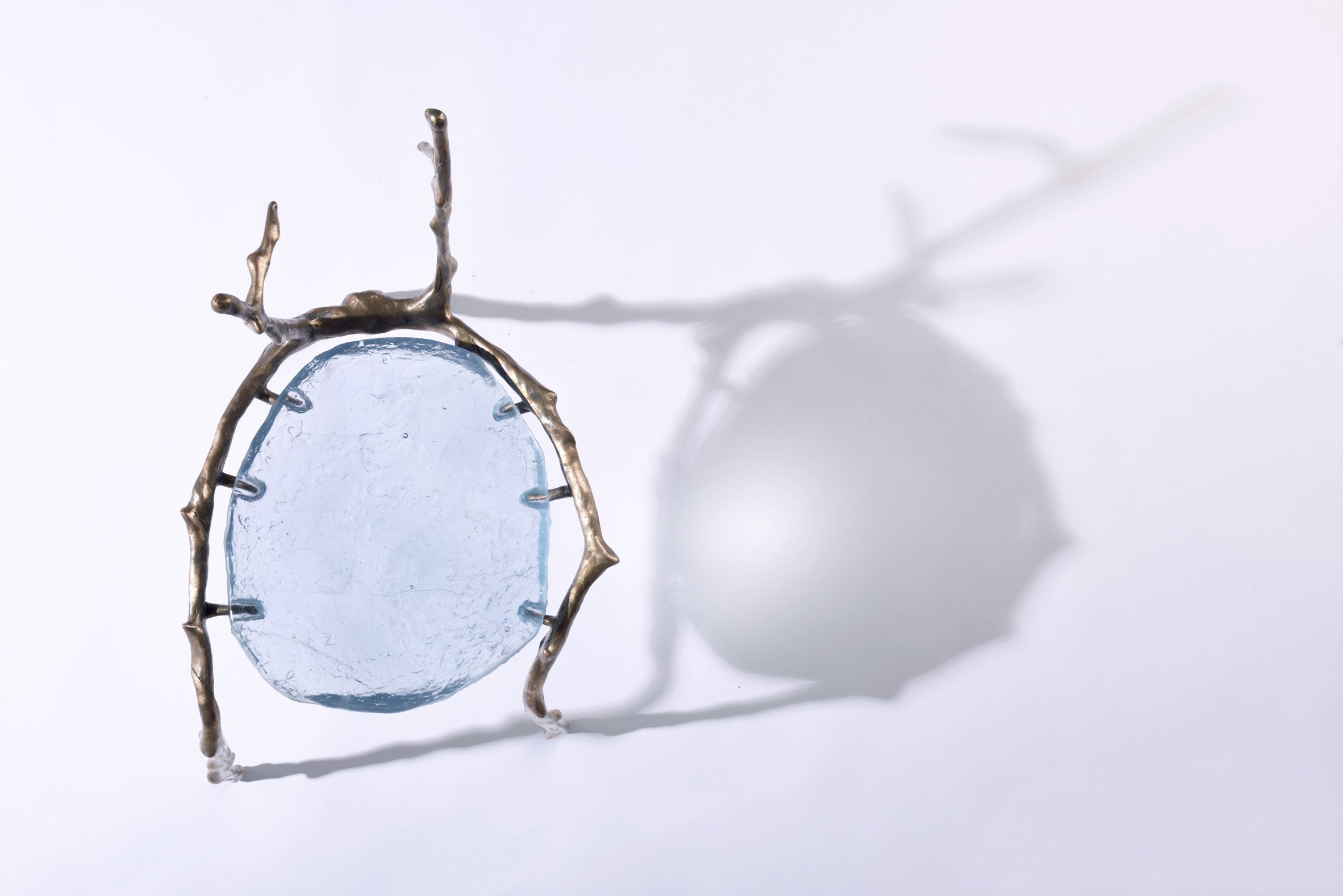 從空中俯視,水藍色的厚片玻璃創造出水一般的質感,靠著手工脫蠟打造而成的銅框,塑造成設計師想要的樣貌。咖啡桌Metsing的名字取自於Sotho,也就是有水之處,三張彼此相連的桌面,看起來就好像比鄰而居的湖泊,寧靜而又清澈,完全不容任何灰塵或髒汙;Kaggen則是「禱告的螳螂」,也因此,由上往下看時,看到的就是某個高舉著觸角的節肢動物。