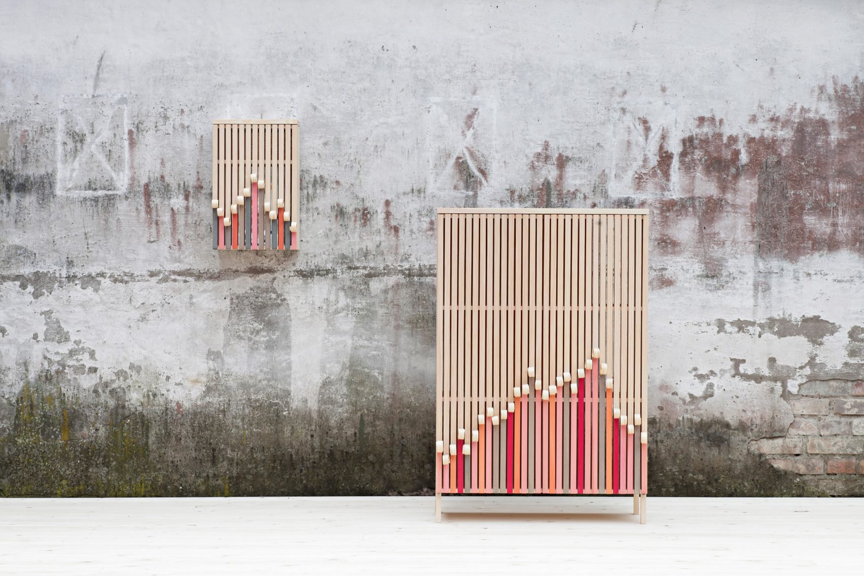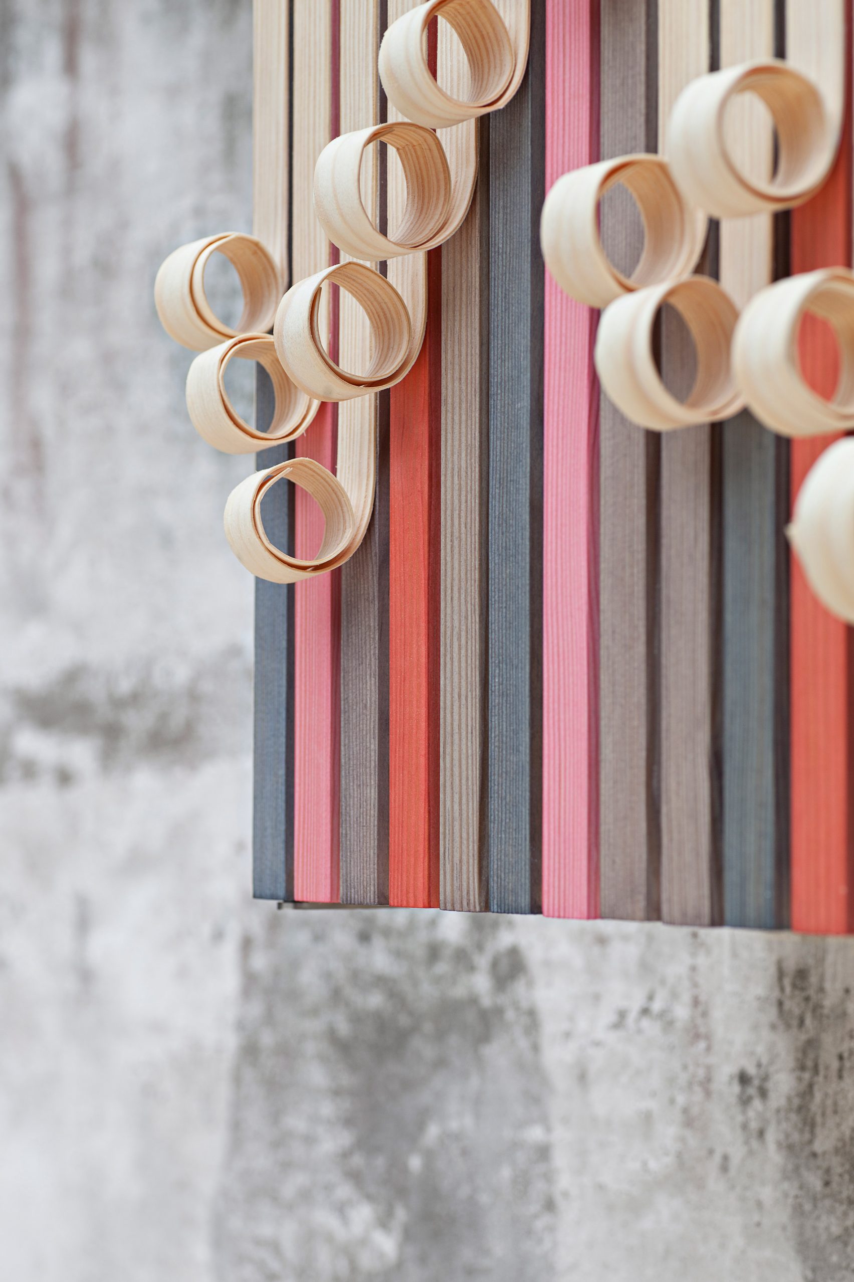 設計師表示,他們希望模仿樹木的天然樣貌,外層像是樹皮的表層或是開始脫落的老舊油漆,微微露出藏在下頭的仍然嶄新、未經破壞的底層。為了凸顯出這樣的對比,設計師刻意將底層的木條,用天然海藻漆塗上鮮紅色、橘色、粉紅色和灰色,與表層的淺色松木,在色彩上形成了強烈對比,設計師還在表層松木上塗了硬蠟,因此表層的樹皮只是看起來有些搖搖欲墜,實際上還是牢固得很。