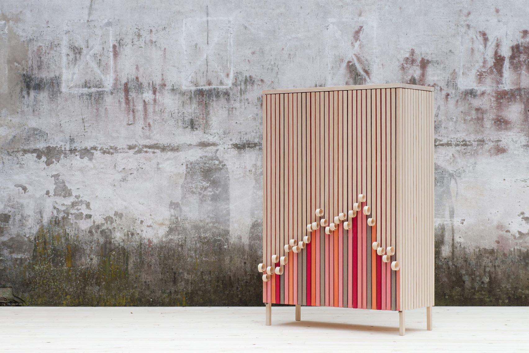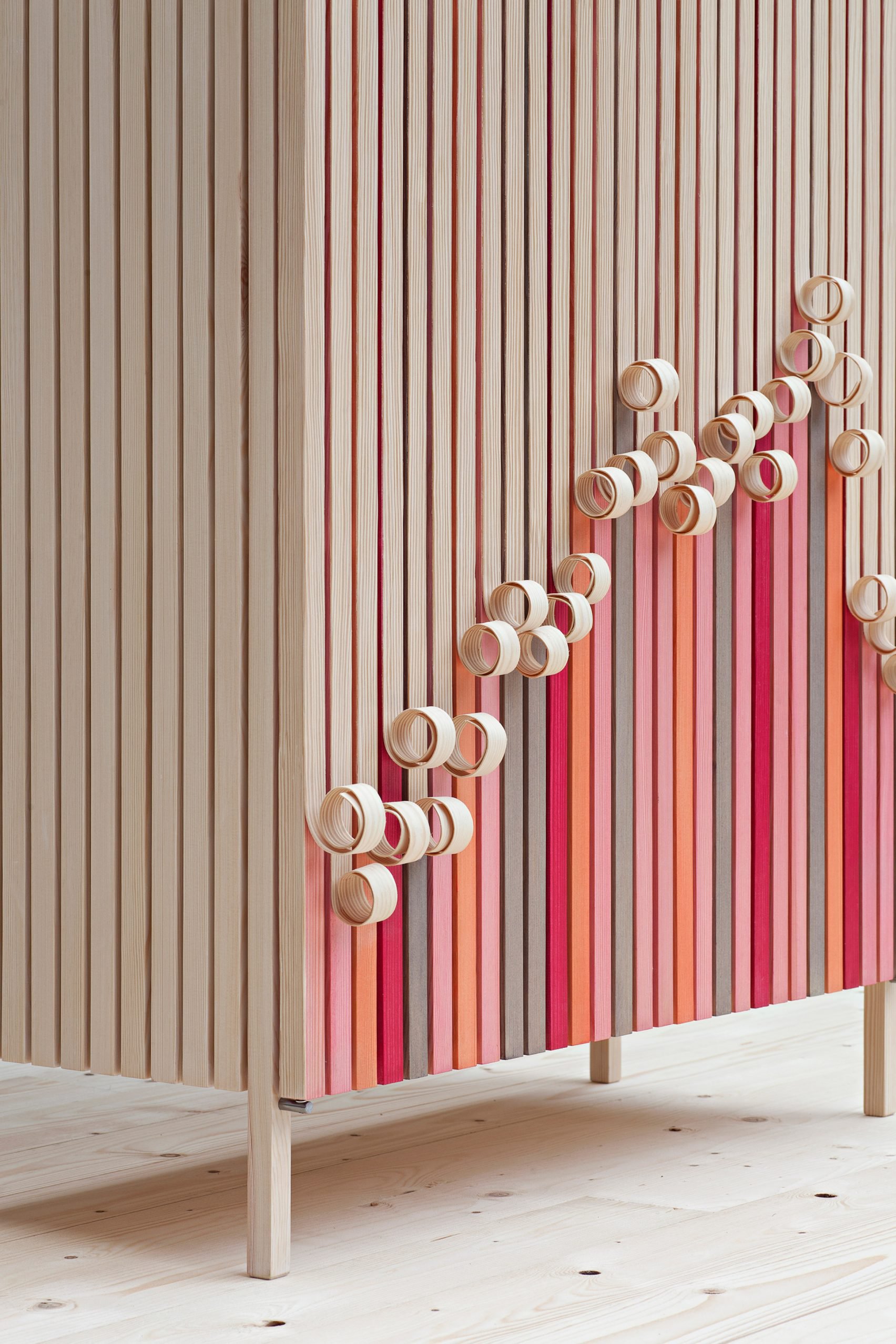 由Jenny Ekdahl、Ola Nystedt和Joel Herslow共同創辦的瑞典設計工作室Stoft,在今年於Klokgebouw所舉行荷蘭設計週中,為「What's your DNA」展創作了一款木櫃Whittle Away,櫃門上一條條像是因為刨過而捲起來的松木樹皮,半掩蓋著下頭的彩色櫃門,頗有「猶抱木頭半遮面」的味道。