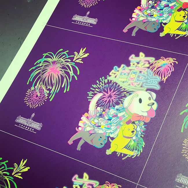 總統賀年卡參考總統認養的 3 隻退役導盲犬形象,並將祝賀文字改為「汪財進寶」,霓虹燈管的手法結合舞龍舞獅的氣氛,可愛又有趣;副總統賀年卡則是以在山林間奔跑的「台灣犬」為主角,霓虹光彩漸層堆疊出台灣的玉山山脈,標語「平安圓滿」如太陽般,慢慢地自重巒疊嶂升起。