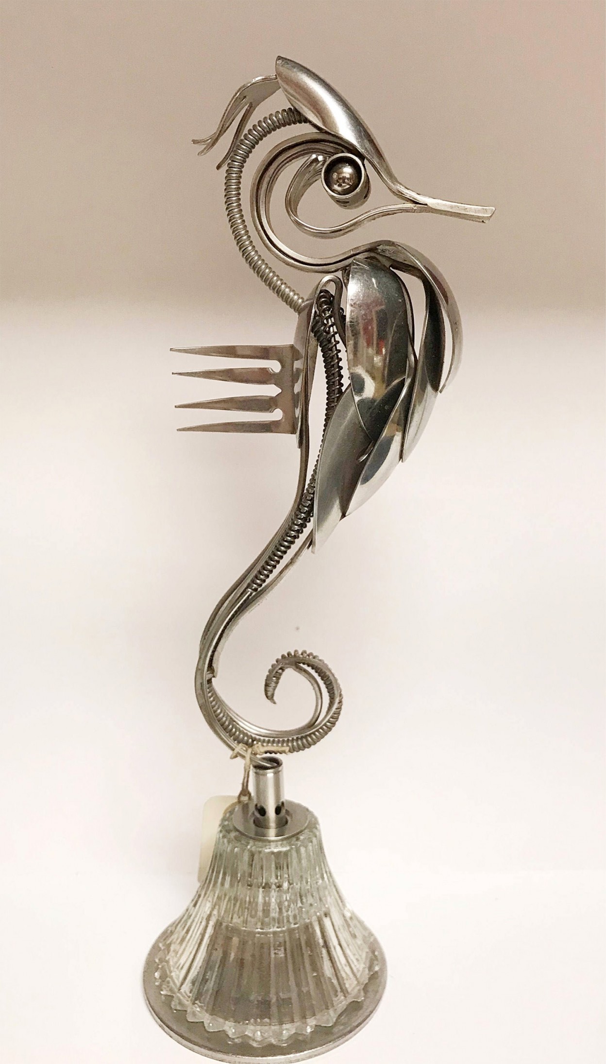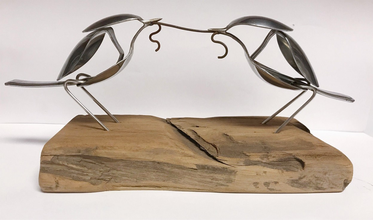 來自南卡的藝術家Matt Wilson將廢棄銀餐具彎折、焊接後,打造成一隻隻知更鳥、貓頭鷹或其他海中生物,固定在漂流木上,變成居家裝飾小物。儘管受限於湯匙、叉子本身構造簡單,使得這些動物也呈現「極簡風格」,卻仍讓人一眼就看出它們的特徵,像是收起來了的翅膀、屁股後拖著的長長的尾巴,幾乎讓人忘了它們的原身其實是餐具。