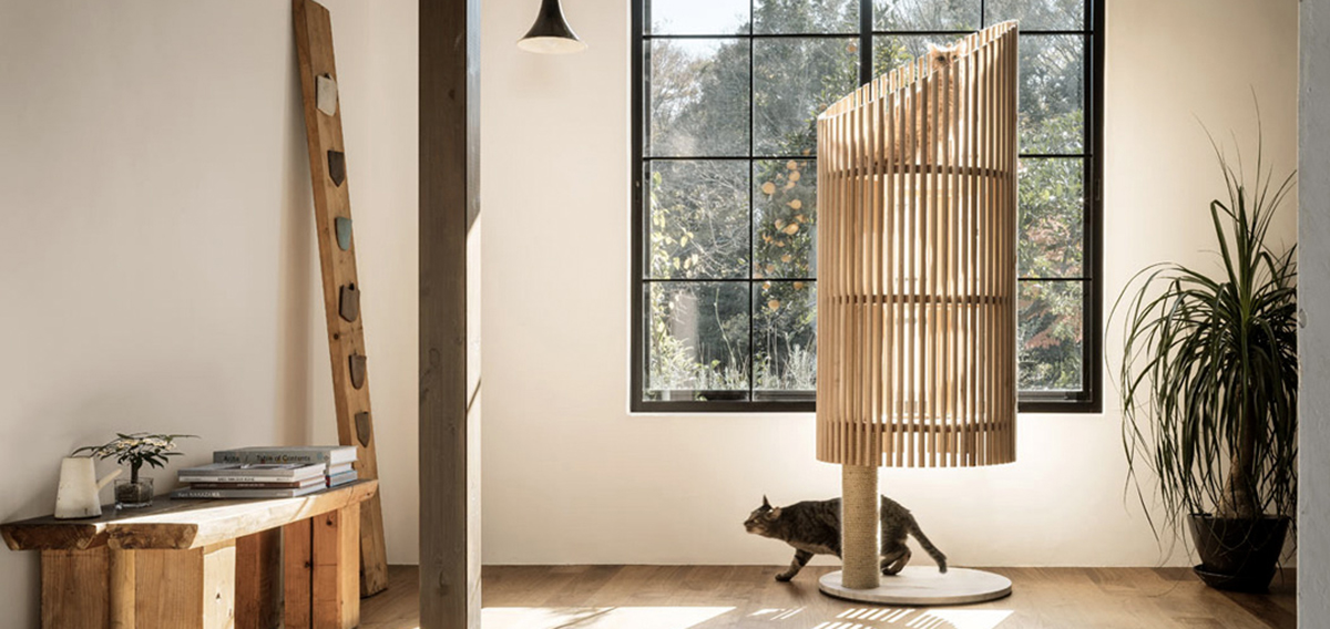 日本貓咪用品公司 RINN 與設計師小宮山洋(Yoh Komiyama)合作,創造出充滿現代感的貓塔 NEKO,以日本飛驒地區的木材,製作成一個個圓桿,並把它們圍繞成一圈,均勻間隔的設計讓光線和貓的身影,都可以穿梭其中,使得這款貓跳台宛若展示於博物館或美術館的雕塑。
