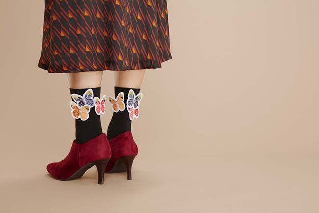 リリコトリコ一共有兩種顏色:黑色和灰色,每雙日幣 2160 元(約台幣 567 元),搭配用的蝴蝶則有八種款式(每款日幣 378 元,約台幣 100 元),每雙襪子最多有 3 個貼片,可以把蝴蝶黏在腳踝後方,相信不久後,走在街上就看見蝴蝶蝴蝶滿腳飛的場景!