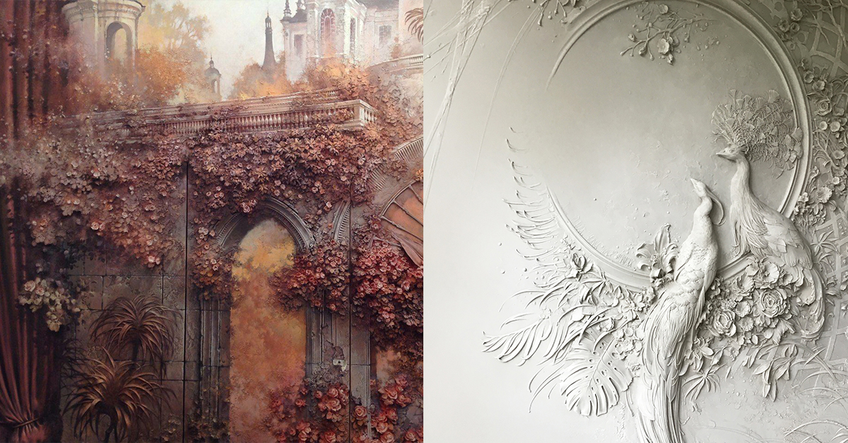 和多數人一樣將白牆當成空白畫布,只不過Tandashvili可不只單單為其染上鮮明色澤和圖案,而是將2D構圖變身3D立體淺浮雕,讓家中看起來就有如古羅馬、希臘帝國的氣派宮殿。