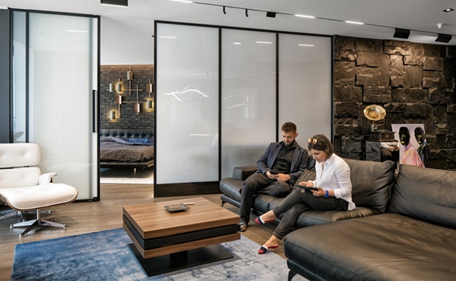 一鍵按下,玻璃便能在霧透之間做切換,不只能夠保留隱私,更可使屋內視野截然不同!烏克蘭建築事務所 33BY ARCHITECTURE 將智能玻璃做為客廳及臥室的隔間,使這處扇形空間可直接大膽切割,不用擔心阻礙視覺、壓縮面積,更可在客人到訪時將之轉換,就能隱蔽臥室維護私隱。