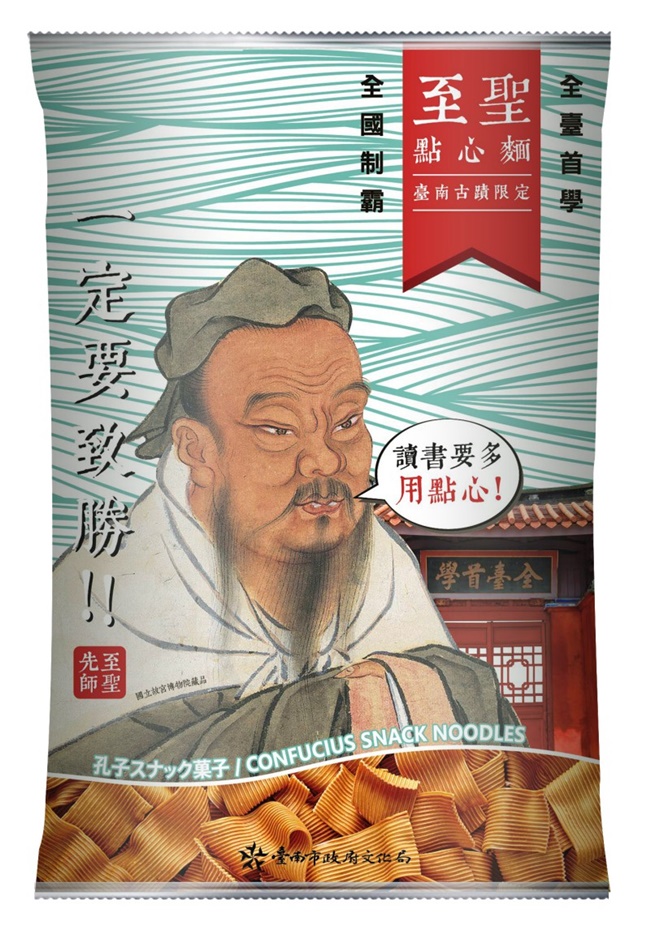 為吸引多元族群走入古蹟、瞭解在地歷史,台南文化局致力推廣古蹟保存及活化的同時,也創意發想古蹟限定商品,為了邀來孔子代言,也特別取得國立故宮博物院館藏孔子圖像授權,攜手知名點心餅國際大廠優雅食股份有限公司,以國定古蹟「全臺首學」臺南孔廟為發想,開發出具正向教育意義的「至聖點心麵」。