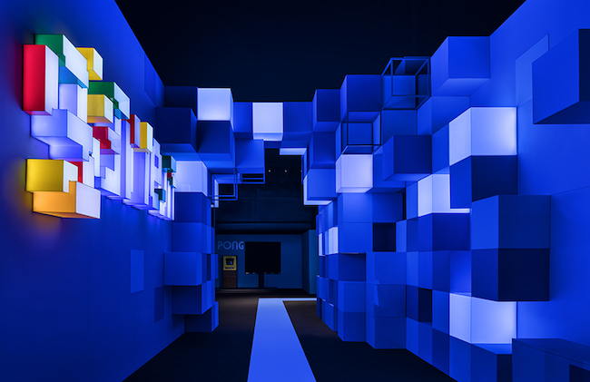 像素塊的形成是早期電玩遊戲產業囿於硬件限制,界面只能做出馬賽克效果,形成了粗糙又別具現代性的視覺語言。遊戲工程師們正通過像素塊實現了與玩家的對話,將其塑造成一個時代的符號。從致敬傳統到面向當下,通過將平面的像素點陣馬賽克轉換成立體的像素塊,形成統一而大小不同的功能空間,設計團隊完成了從虛擬遊戲畫面過渡到現實體塊的角色轉換。