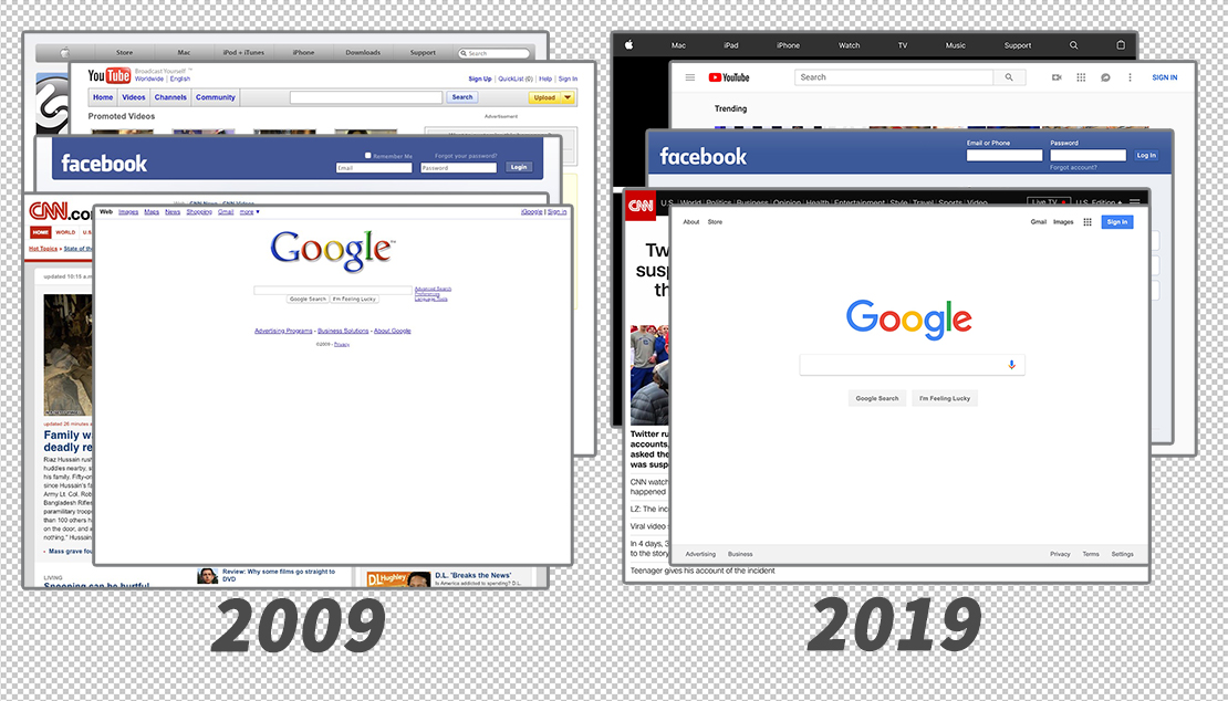 全球最大的搜尋引擎 Google,在 2009 年時的 logo 還是 1999 年時設計的版本,使用的是 Catull 字體,字體上下還有陰影設計;而現在則是 2015 年重新設計的版本,拿掉了陰影和高光效果,採用無襯線風格,扁平化了一番後,現在的頁面比起十年前看起來更簡潔了。(是說有人知道 Google 在 1998 年創立後的第一版 logo 仿照了 Yahoo!,在最後還加了個驚嘆號嗎?)