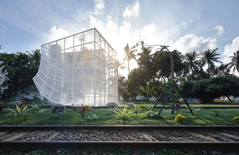 跨界玩轉藝術與建築領域,「NOOK 光合台東」以「room for noting but room for everything」為概念,長寬高皆為8公尺的立方體架構下,覆上白色紗網於其中,完整的幾何形體竟在接觸地面的角落如同柔軟的織品被掀起,FAHR 021.3解釋,這正是迎向大眾、引導人們進入NOOK 光合台東的入口,開闢出一個自由的場域。