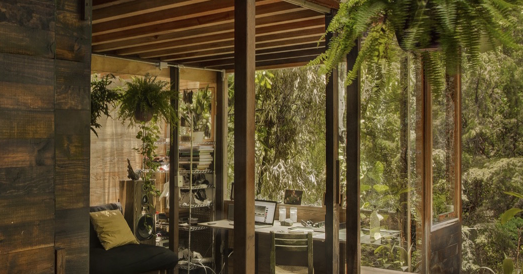 整間木屋全都是用木頭打造而成,包括木屋的外牆、室內的牆壁、地板、天花板和傢俱。一樓被切割成室內、室外兩個空間,室外的客廳擺滿了盆栽,模糊了與森林之間的界線,而室內的工作室則面向戶外,身後則還有間小廚房和鼓組專用區,總覺得在這兒工作,心思很容易就不小心跑到窗外,或是被嘴饞的舌頭、內心深處手癢的節奏靈魂給帶著跑。