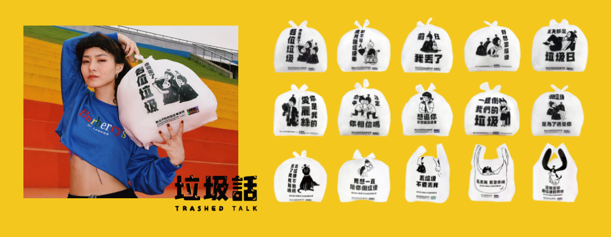 「垃圾話」意指平常與三五好友之間幽默吐槽的「幹話」,林芷恩、周君璇、侯覺菲、陳欣儀等這四位台藝大視覺傳達設計系學生的畢業設計作品「垃圾話」環保兩用袋,起點就從這裡開始:在發想畢業製作主題不斷碰壁,在逼近崩潰邊緣和挫折不斷襲來的壓力時,迸出一句:「好想當垃圾」這句幹話,宛如打開了他們的創作靈感泉源,在袋上印上有一系列幽默插畫、語句的限定環保兩用垃圾袋因運而生,也在今年金點新秀設計獎中的《社會設計類別》脫穎而出。