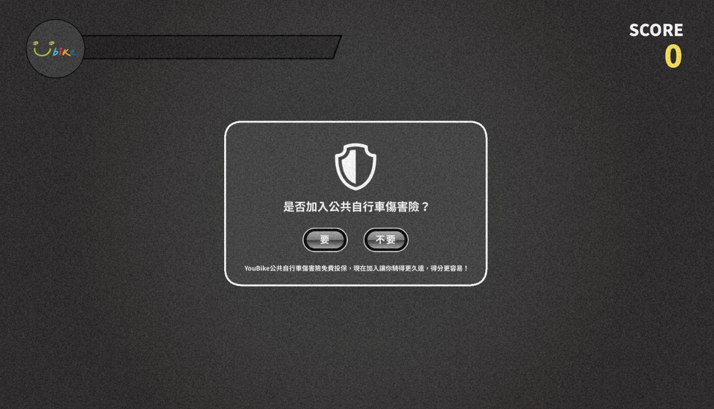 這個看似插花用的對話框,其實是加分的小幫手喔,加入這個傷害險,遊戲中可以得分更快速、現實中則可以免費投保,Youbike 族玩完記得快點去保!
