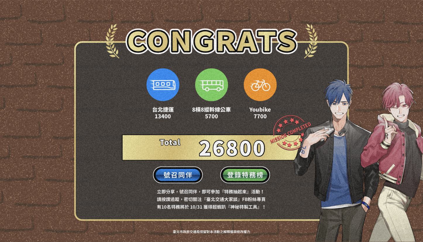 聽說遊戲結束後的積分結算畫面,會影響出場的謝幕的人數(編輯第一次玩的時候分數超低的XD),如果你能成功召喚出五個角色,就代表你的積分高到足以登陸特務榜和其他人較勁,除此之外,「臺北交通大家談」粉絲頁也針對這波遊戲推出小贈品,遊戲同時也支援手機(但是沒有全螢幕 Orz),上班上到昏昏欲睡時,不妨起身溜到茶水間或廁所玩一波醒醒腦吧(亂教XD)