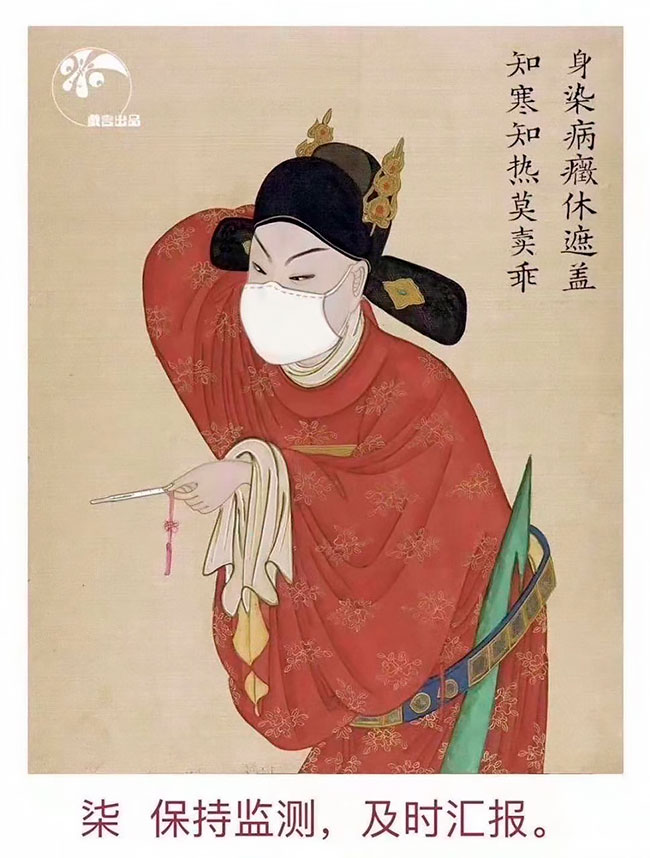 京劇在十九世紀末期十分流行,這些像冊詳細的記錄著九齣戲、一百個角色的化妝與服裝,同時也映證了當時舞台文化的多樣化及活力,在原本的像冊中,每個畫像旁都有簡單的題詞,右上角也用比較大的字體,標註角色的名字和劇名。如今這些京劇人物們臉上戴著口罩,畫像旁還有兩行打油詩化的「防疫須知」,提醒著大家戴口罩、隔離和定時測量體溫,如此詼諧的表達方式,相信在大家排隊買口罩時,或多或少能發揮一點苦中作樂的效果,幫助大家排遣無奈的心情。