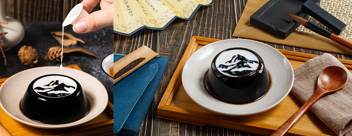 故宮表示,2010 年起舉辦國寶衍生商品設計競賽,並將具市場發展性的得獎作品商品化,提升博物館文創產值、開創新生活美學。此次搶鮮上市的「墨戲仙草」,是去年第八屆國寶衍生商品設計競賽金獎作品。得獎者王蓓恩、劉家欣將故宮名畫〈清 石谿 雲山煙雨〉搖身一變成為經典甜品仙草凍,當奶球淋在仙草凍上,增添風味的奶精流動於層層峰巒,在黑白相間中交織光影流轉的山水詩意,創意玩轉故宮名畫的感官體驗。