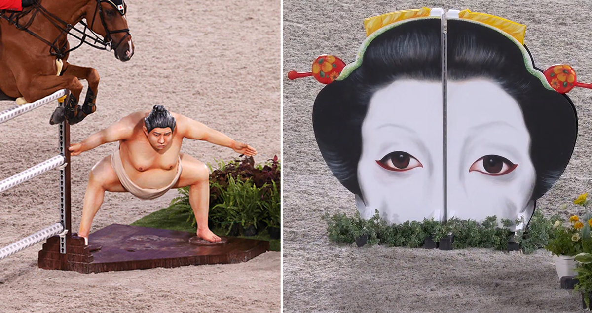 本屆東奧馬術障礙賽中設置了多道關卡,幾乎每道的設計都融入了與日本文化相關的元素,其中一個飾有逼真相撲雕像的「相撲塔與摔跤」關卡,擺出準備進攻姿勢的相撲似乎讓許多馬匹受到驚嚇,不敢靠近便繞道而行,造成無奈又有趣的小插曲。