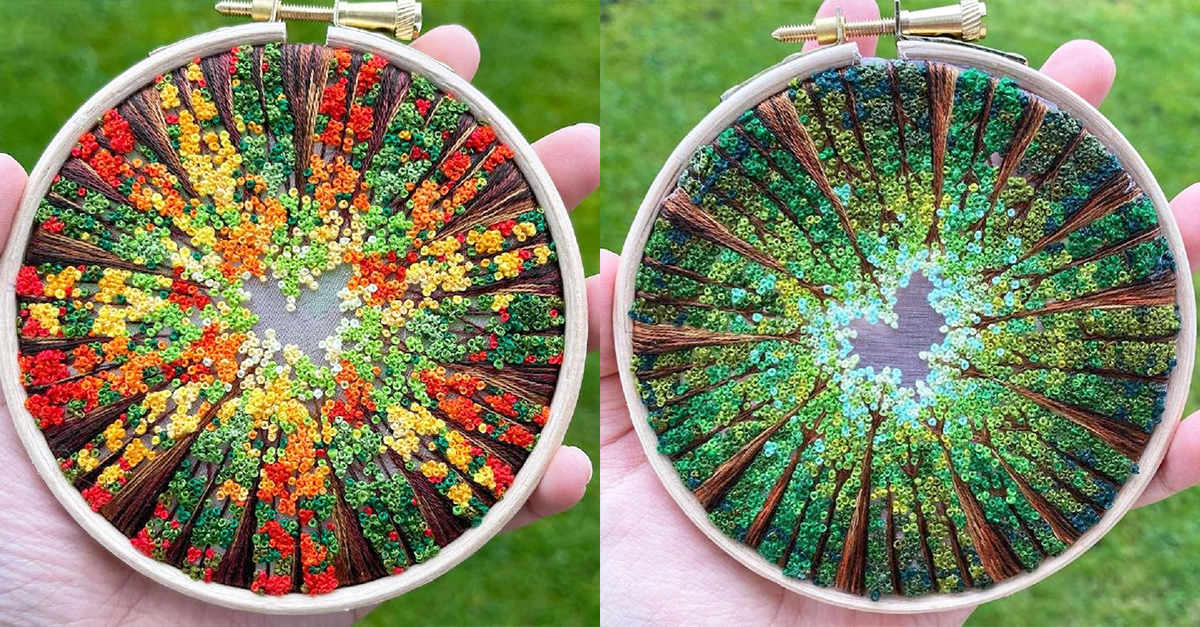 許多藝術家喜歡用刺繡展現自然之美,帶著大家在小小的繡框中,看見大大的世界,英國藝術家Sew Beautiful也不例外,她以彩色繡線和法國結粒繡,繡出樹木與森林的美麗,高大而茂密的樹木以及盛開的花朵,順著圓形的繡框,自成一幅風景畫視窗,即使待在家中,也能透過她的作品,享受大自然。