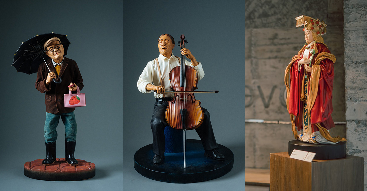 段安國以一尊塑鋼土做的人偶為基底,以皮革繃塑出「雨那欸落未停」、「雨中豐收」兩款人像,為觀者拆解皮塑工藝的多變,一個母胚卻能塑出全然不同的人偶與氛圍。
